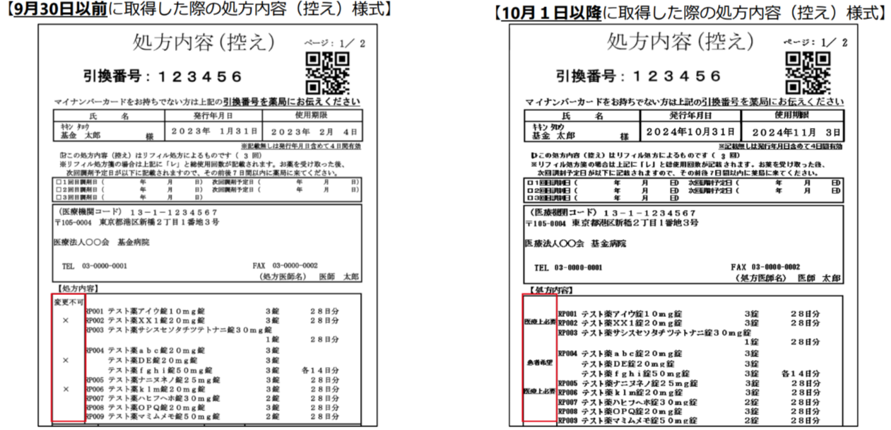 ※なお、処方内容(控え)における表示は、処方内容(控え)を取得した日(9月30日以前・10月1日以降)の別で、切り替わります。処方日に応じて、処方内容(控え)が出力されるわけではありませんので、この点、ご留意いただくようお願いいたします。