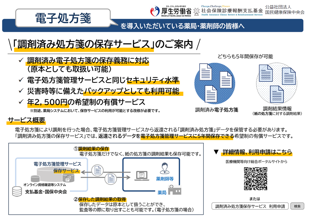※ 調剤済み処方箋の保存サービスの利用に当たっては、電子処方箋管理サービスの機能の1つであることから、電子処方箋の利用申請をされていることが前提になり、薬局のシステムが電子処方箋による調剤に対応かつ保存サービス利用可能となる改修済みであることが必要です。詳しくは電子処方箋を導入されたシステム事業者にご確認ください。