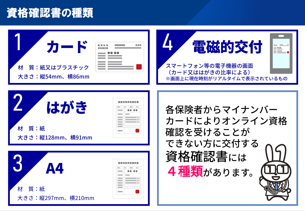 マイナンバーカードによりオンライン資格確認を受けることができない方に交付する資格確認書は以下の4種類です。