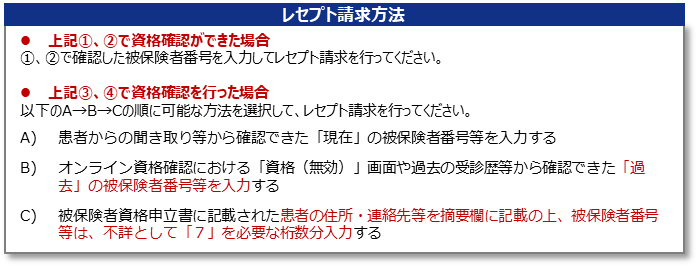 「資格(無効)」または「資格情報なし」等の結果が返ってきた場合においても、有効な保険資格を有する方が適切な自己負担分(3割分等)の支払いで保険診療を受けられるよう、以下の方法で資格確認及びレセプト請求を行ってください。