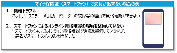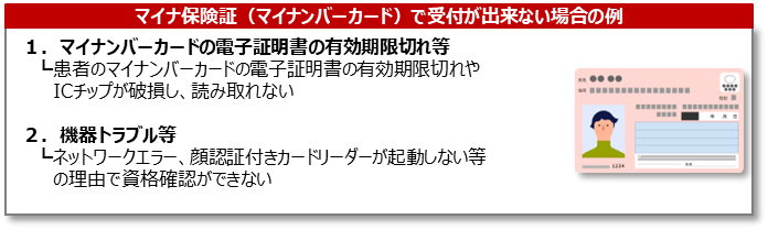 何らかの事情でマイナ保険証(マイナンバーカード・スマートフォン)で受付が出来ない場合でも、有効な保険資格を有する方が適切な自己負担分(3割分等)の支払いで保険診療を受けられるよう、診療報酬請求を行うための情報を以下の方法で収集するなど、ご協力をお願いします。