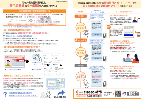 なお、マイナンバーカードの電子証明書の有効期限は、医療保険の資格とは別に定められているものであり、電子証明書の有効期限切れとともに、医療保険の資格自体が喪失するものではありません。