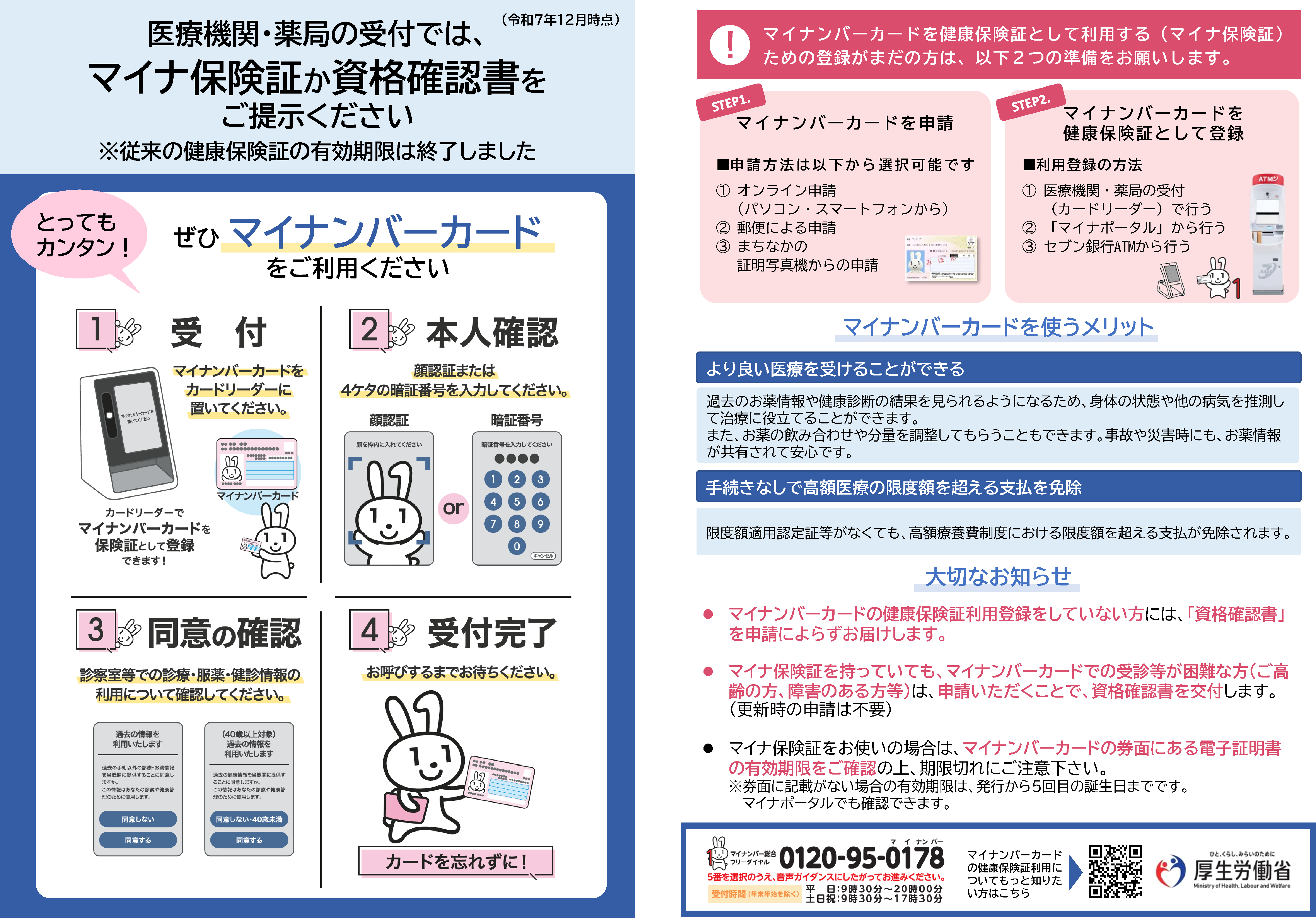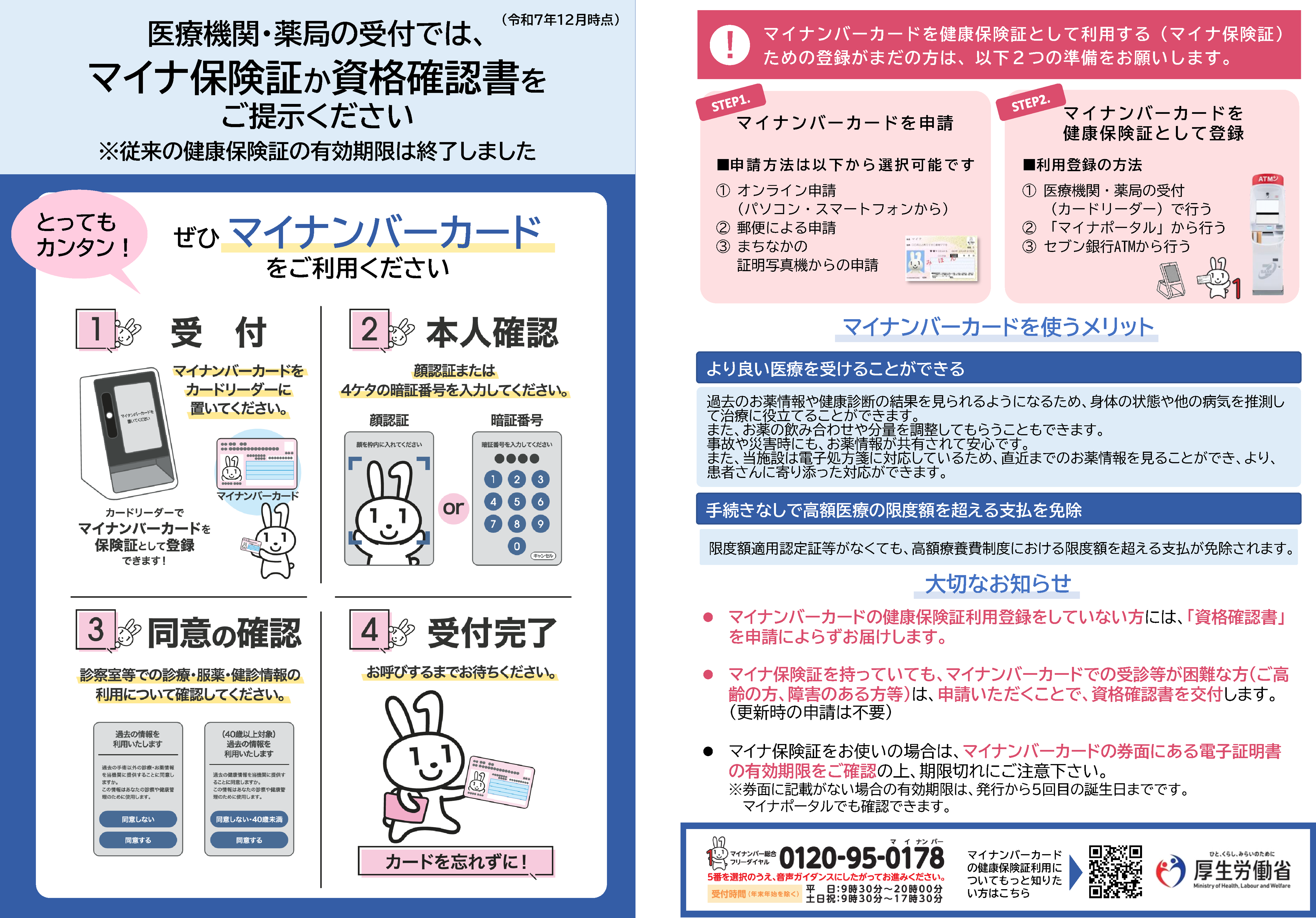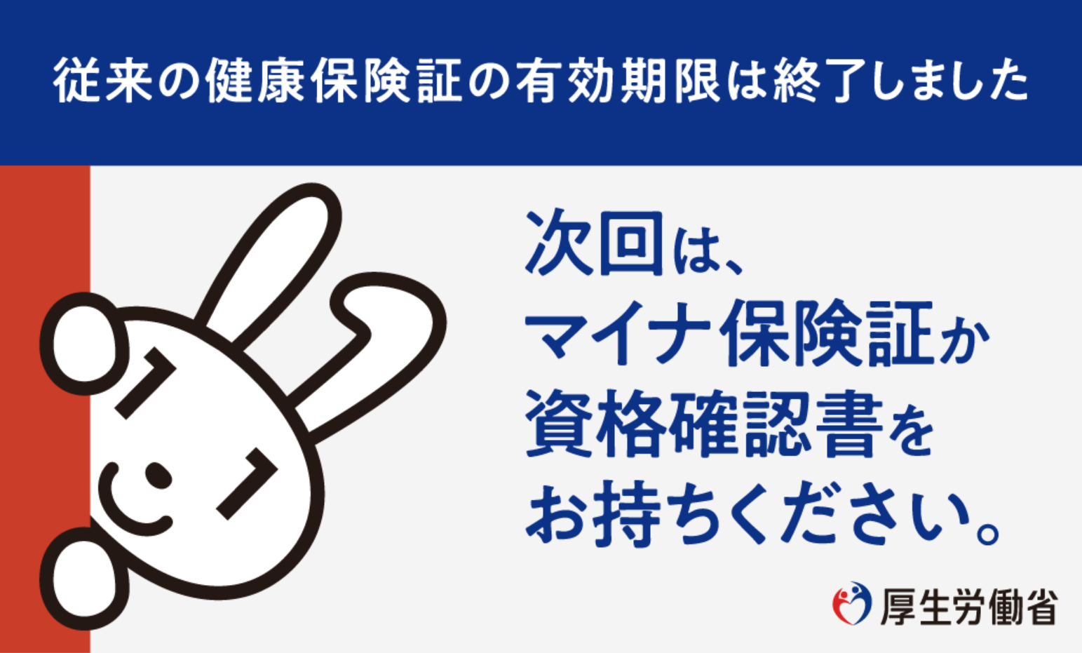 令和7年12月1日に、発行済みの全ての健康保険証の有効期限が満了し、マイナ保険証を基本とする仕組みへと移行しております。