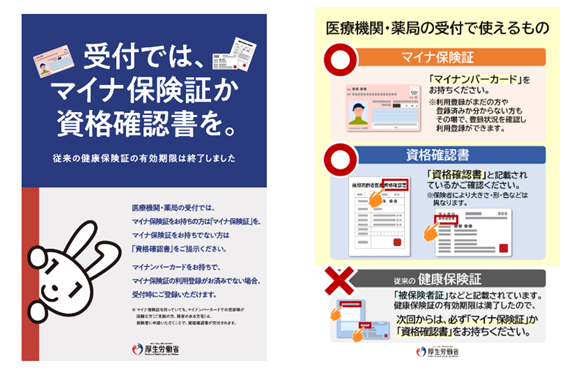 今後は、マイナ保険証(マイナンバーカードまたはスマートフォン)か資格確認書で資格をご確認ください。