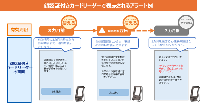 また、顔認証付きカードリーダーでも、有効期限の3か月前からアラートが表示されます。