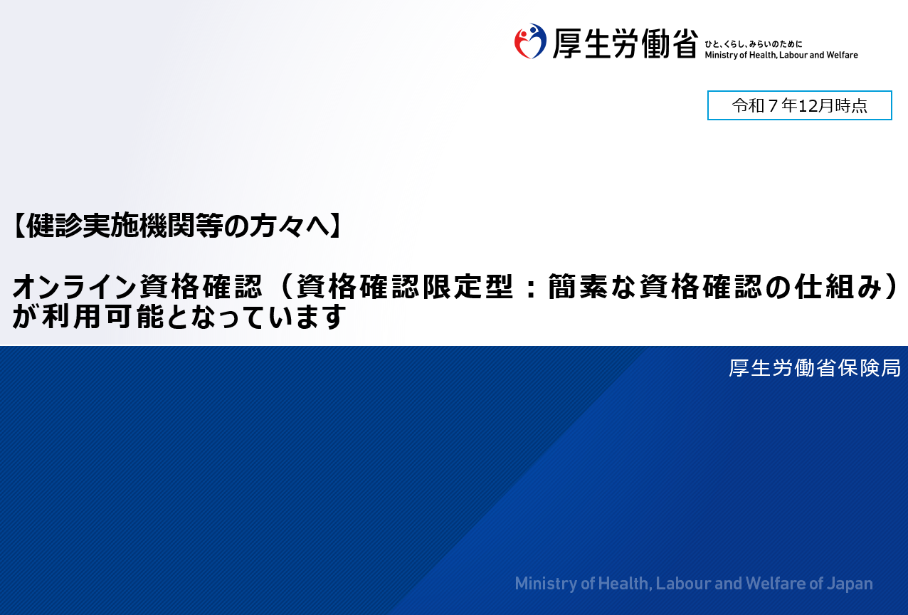 令和6年(2024年)12月2日より現行の健康保険証が新たに発行されなくなり、マイナ保険証を基本とする仕組みに移行することに伴い、マイナンバーカードを用いて利用者の資格情報のみを取得できる仕組みが始まりました。