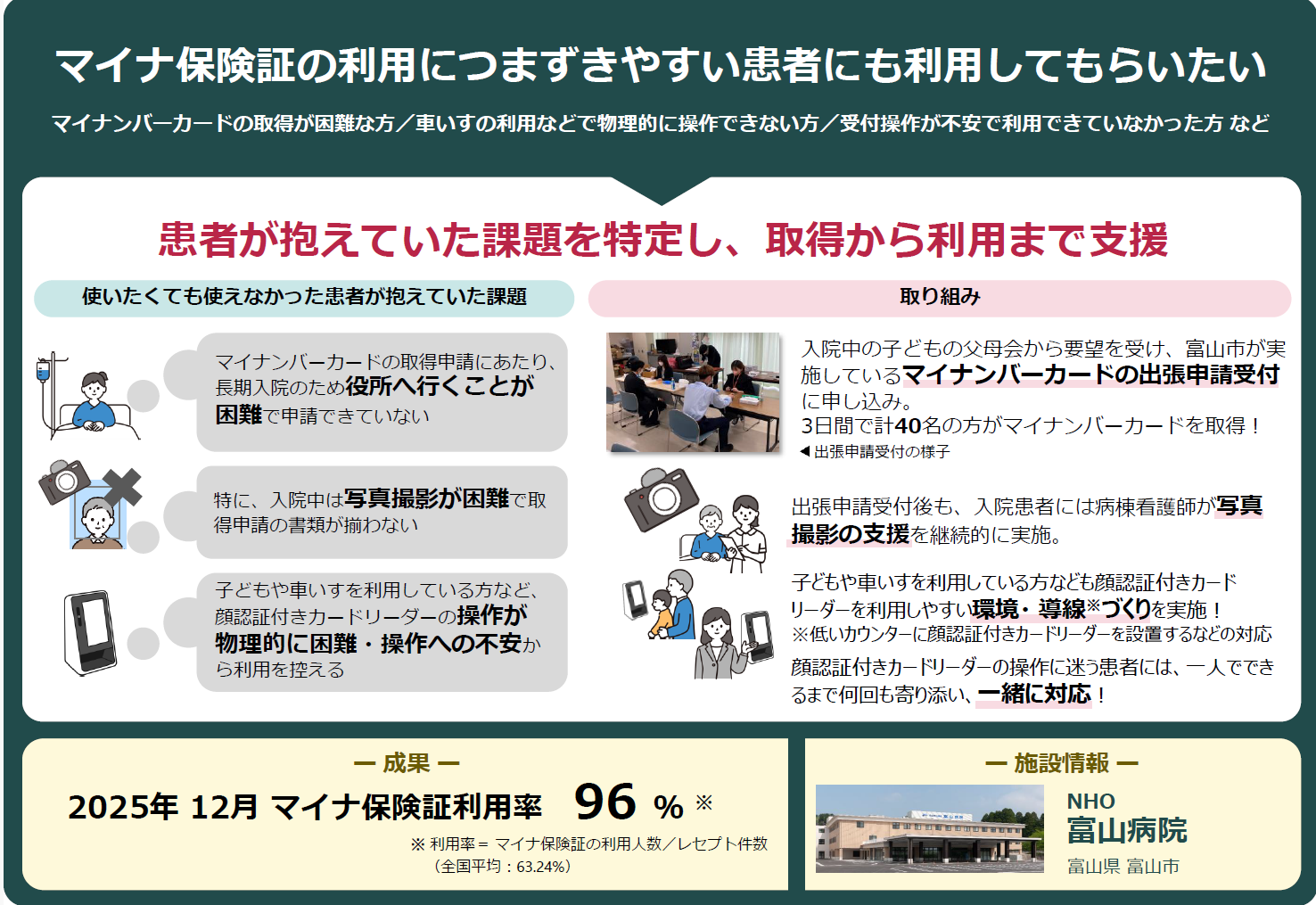 ・「マイナ保険証の利用につまずきやすい患者にも利用してもらいたい」ことに対して、病棟看護師が写真撮影の支援等をする等、「患者が抱えていた課題を特定し、取得から利用まで支援」