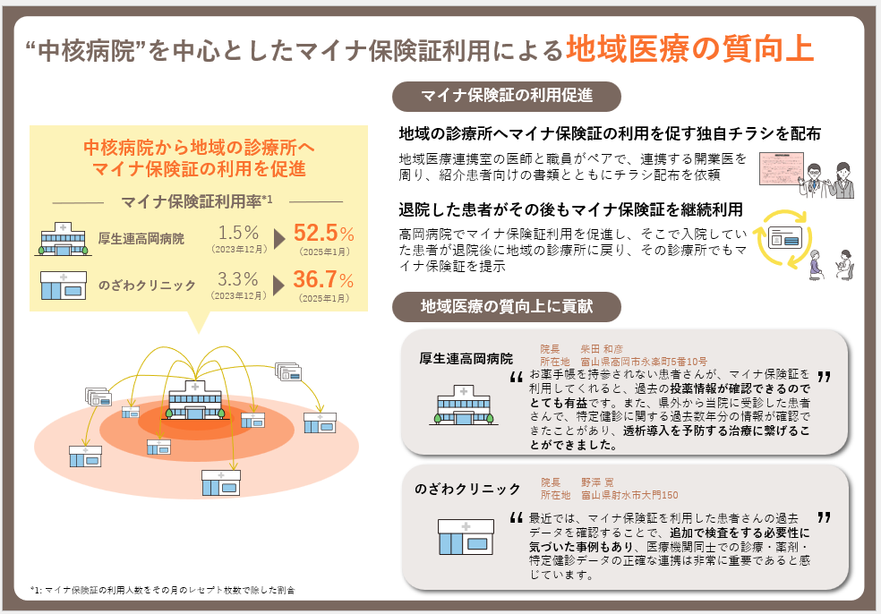 中核病院が診療所と連携してマイナ保険証に関するチラシ配布や退院後の継続利用支援を行ったところ、投薬履歴や特定健診データを即時参照できるメリットが診療精度を高め、地域医療の質向上に寄与したと報告されています。取組結果として、両施設のマイナ保険証利用率が大幅に向上しました。