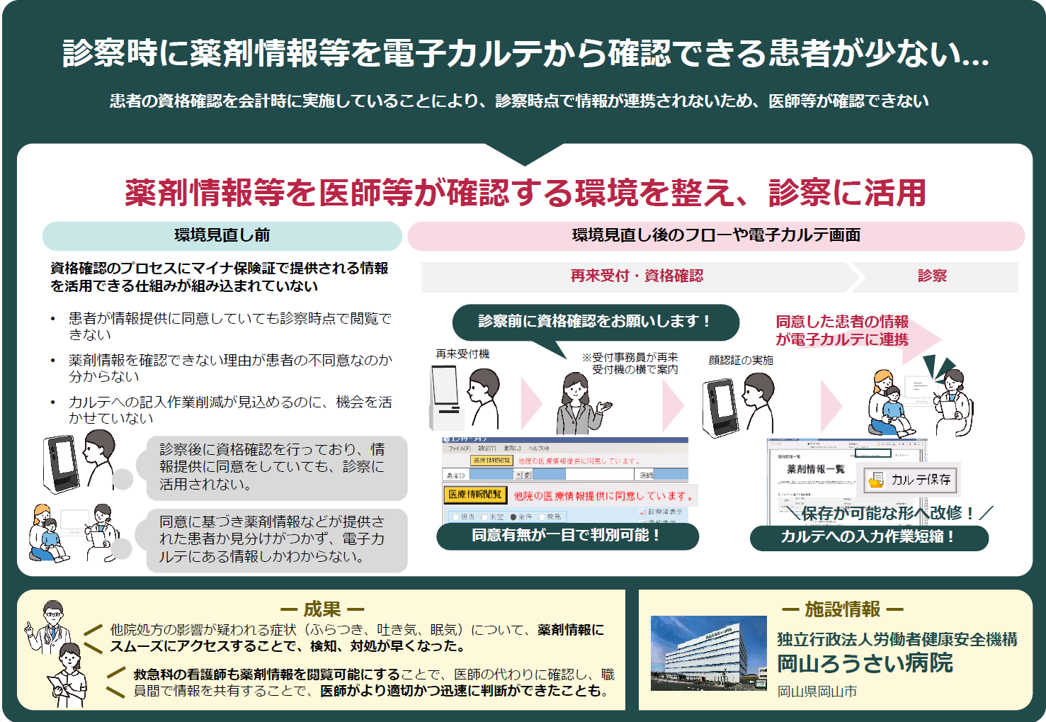 ・「診察時に薬剤情報等を電子カルテから確認できる患者が少ない…」ことに対して、診察前に資格確認を実施するように声がけし、「薬剤情報等を医師等が確認する環境を整え、診察に活用」