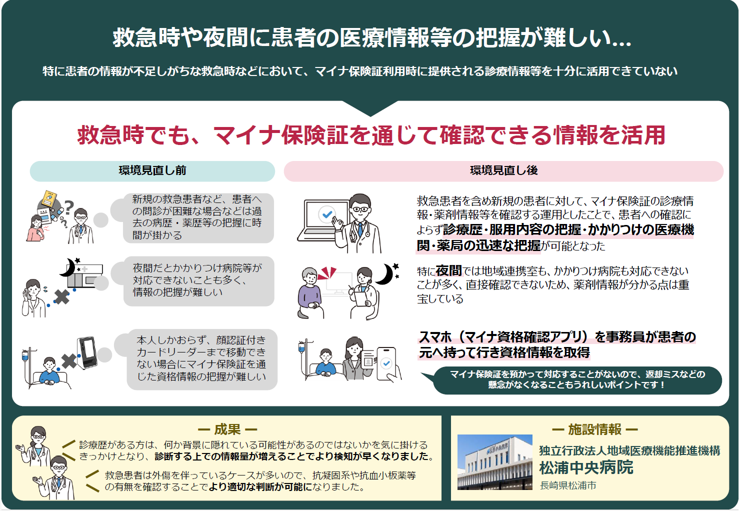 一方で、医療機関・薬局の現場では「マイナ保険証の利用につまずきやすい患者への支援」「医師が診療情報等を十分に活用できる環境の整備」「救急時や夜間における患者情報の迅速な把握」といった課題も依然として存在しています。