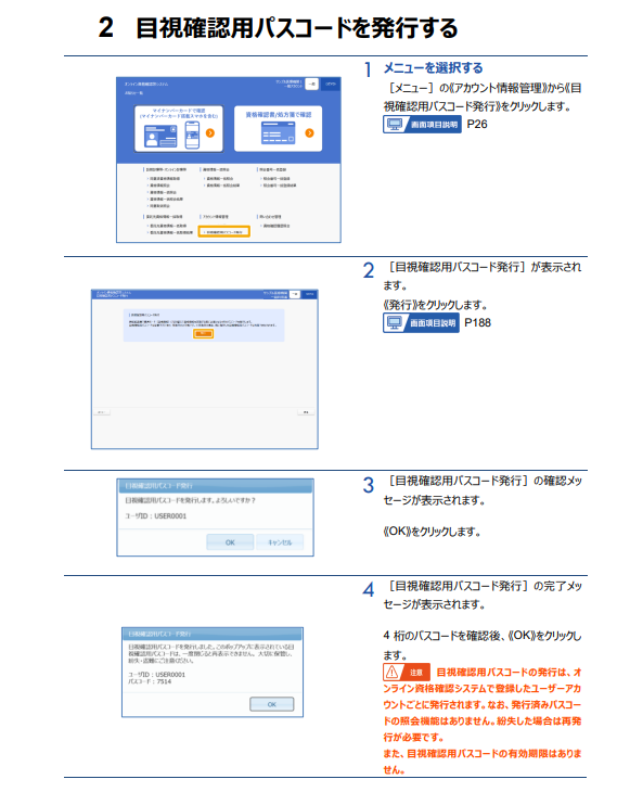 なお、目視確認用パスコードの発行を含めた操作手順については、オンライン資格確認等システム 操作マニュアル (一般利用者・医療情報閲覧者編) の第9章(183ページから188ページ)をご参照願います。