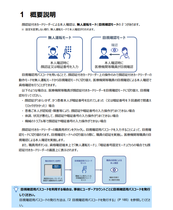 顔認証付きカードリーダーで目視確認を実施するためには、資格確認端末またはレセコン等で目視確認用パスコードを発行する必要があります。
