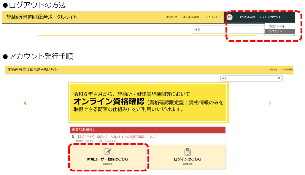 「施術所等向け総合ポータルサイト」に遷移した際には、一度ログアウトを行い、再度「健診実施機関等コード」を用いてアカウント発行、ログインを行ってください。
