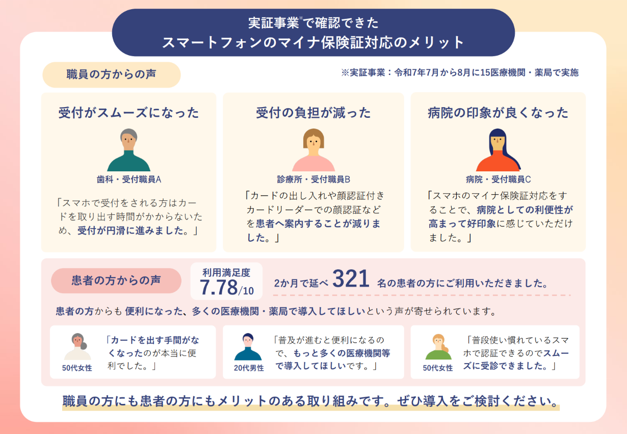 この記事では、スマートフォンのマイナ保険証対応に関して、令和7年7月から8月に行われた実証事業において、実際にスマートフォンのマイナ保険証を利用した患者や受付職員の声をもとに、導入におけるメリットを紹介しています。