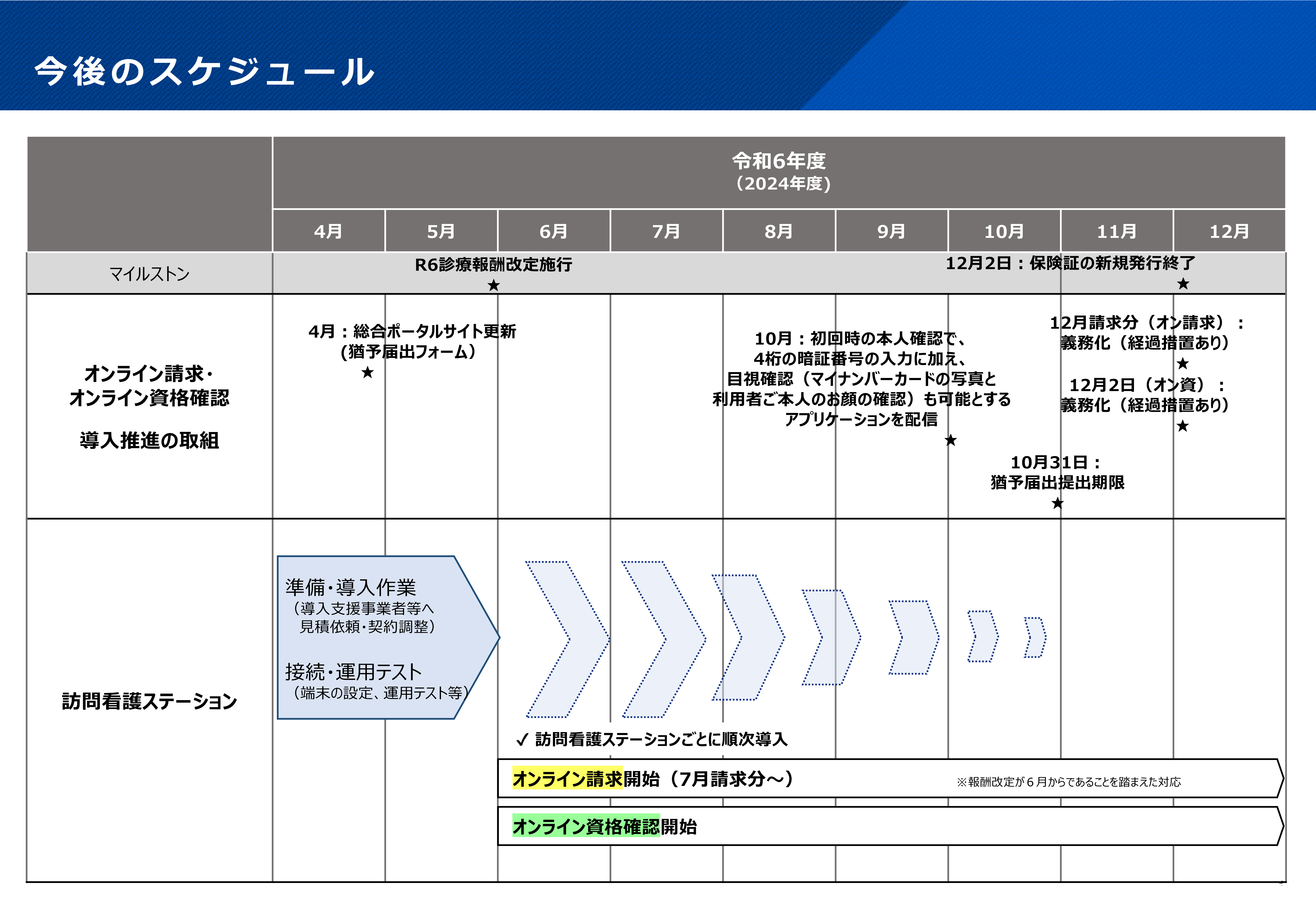 健康保険証の新規発行終了時期(※)から、オンライン請求及びオンライン資格確認を義務化し、やむを得ない事情がある訪問看護ステーションについては、期限付きの経過措置を設けることとされました。