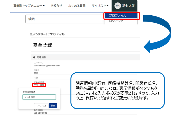 承継元機関より医療機関等向け総合ポータルサイトのアカウント情報の連携の後、メールアドレス、パスワード、関連情報等のご変更を行いたい場合は、本ポータルサイトにログイン後、右上の申請者名にカーソルを合わせた際に表示される≪ユーザープロファイル≫より行ってください。