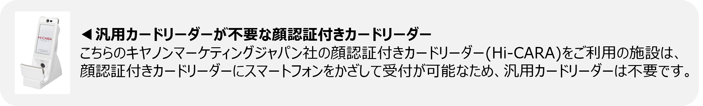 ※既にお持ちの汎用カードリーダーを使用する際は、汎用カードリーダー内のソフトウェアバージョンや顔認証付きカードリーダーとの組み合わせにより、スマートフォンの読み取りが正しくできない可能性があります。新たに汎用カードリーダー等が必要な場合は、指定された専用ページからの購入をご検討ください。