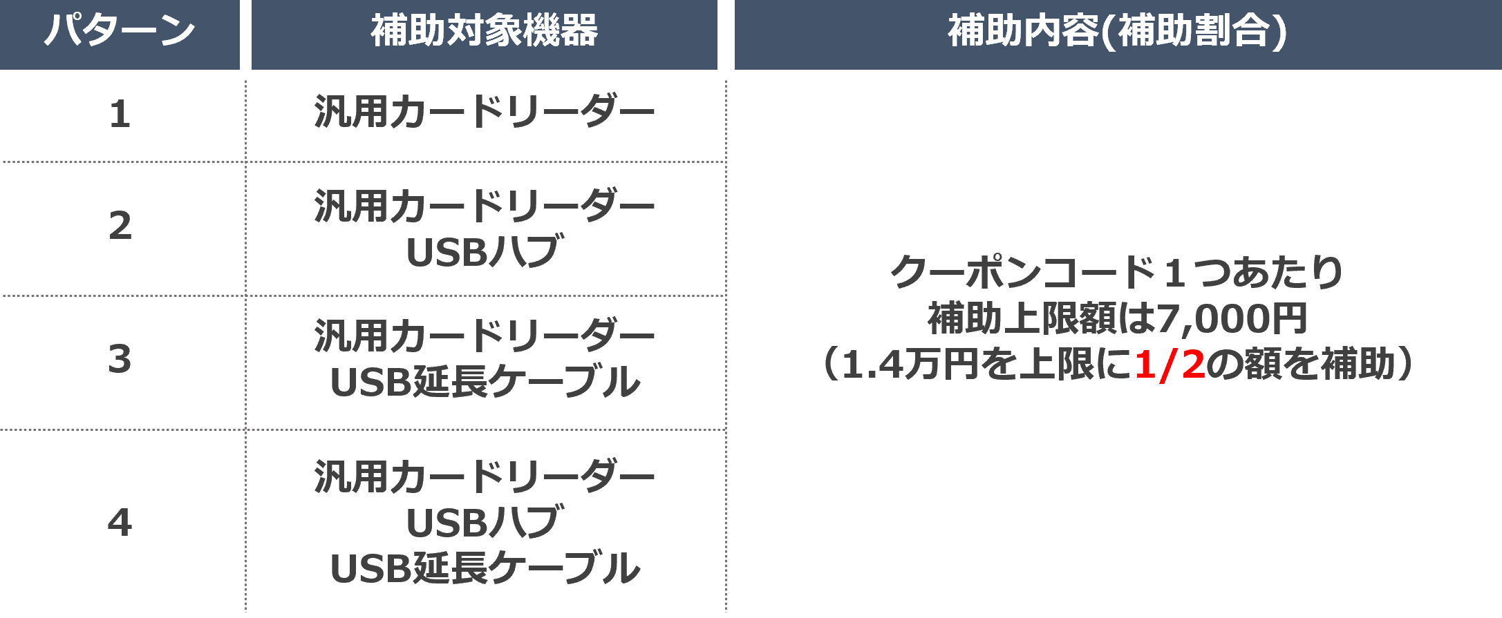 1つのクーポンコードで、費用補助が受けられる購入パターンは、以下の1~4通りです。