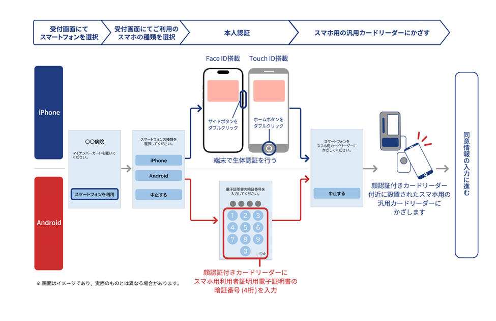 ※訪問診療等・オンライン診療等においてスマホ搭載されたマイナ保険証に係る追加対応は不要ですが、令和7年9月時点では、マイナ資格確認アプリではご利用いただけません。