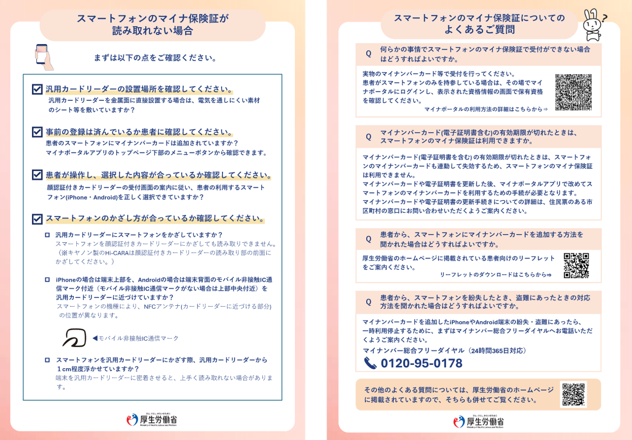厚生労働省のホームページにて、スマートフォンのマイナ保険証が何らかの理由で読み取れない場合に確認すべきポイントや、よくある質問をまとめたリーフレットを掲載しておりますので、ぜひご活用ください。