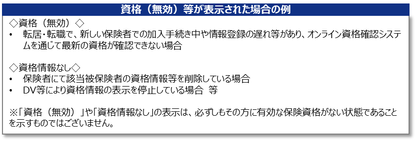 ※ 「資格(無効)」等が表示される場合、マイナポータルでも最新の有効な資格情報は確認できません。