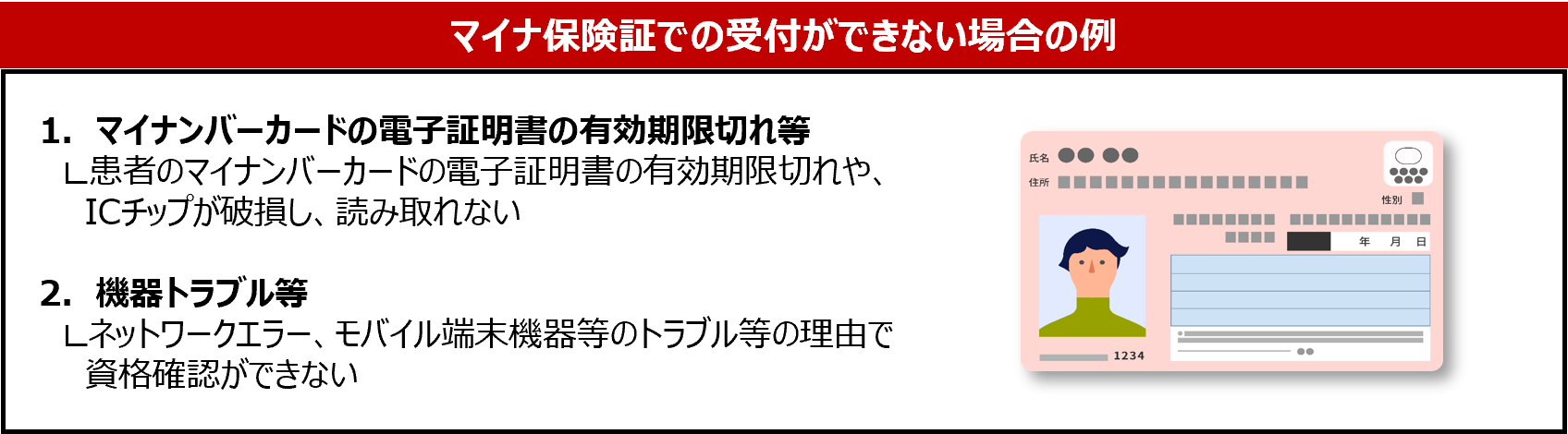 なお、マイナンバーカードの電子証明書の有効期限は、医療保険の資格とは別に定められているものであり、電子証明書の有効期限切れとともに、医療保険の資格自体が喪失するものではありません。