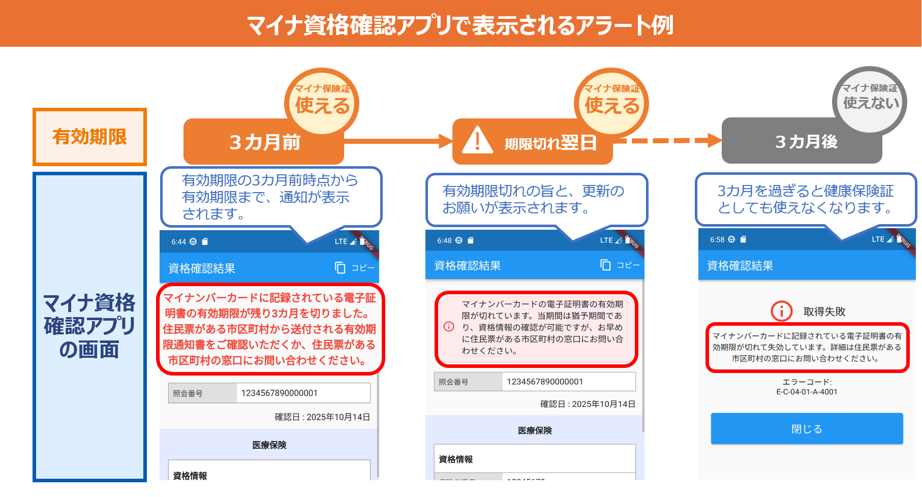 また、オンライン資格確認を行うためのマイナ資格確認アプリの資格確認結果画面に、有効期限の3か月前からアラートが表示されます。表示される内容は以下をご確認ください。